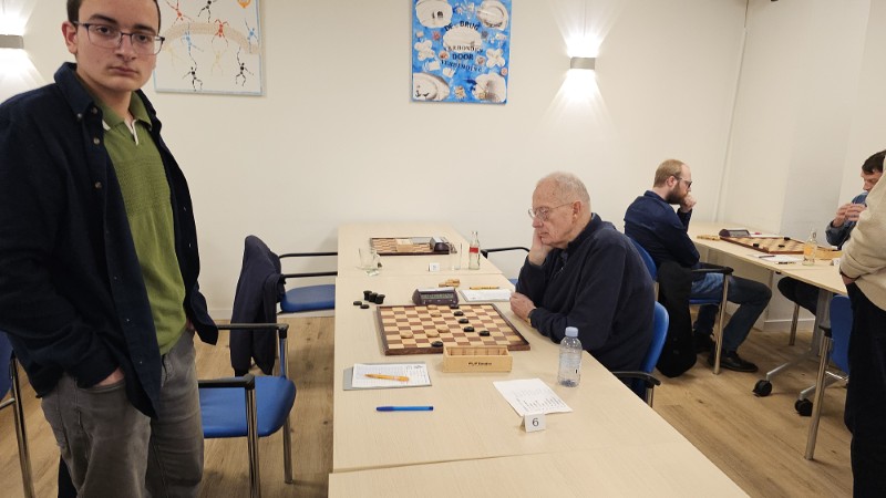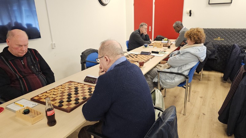 Waldo Aliar had het lastig tegen Marino Barkel. Toen Marino het naliet de winst af te dwingen op de 48e zet, had Waldo de kans remise te grijpen. Helaas miste hij dit en ging de partij alsnog verloren. Peter van der Stap kwam een schijf voor in een acht om acht stand maar moest berusten in remise. In de analyse is overigens geen winst te vinden voor Peter. Frits Luteyn speelde tegen oud-Schiedammer Jitse Slump. Waar Frits op de 42e zet een rustige twee-om-twee kon nemen met remise als meest logische uitslag, nam hij iets te veel risico. Jitse leek dit af te straffen en had ook kunnen winnen. Omdat hij echter verkeerd sloeg stond er plots weer een remisestand op het bord. Helaas verslikte Frits zich in het tric-trac eindspel .